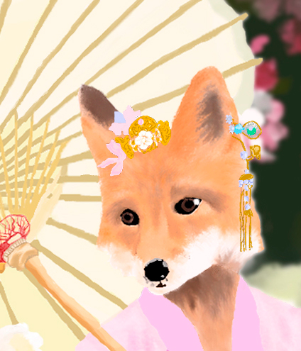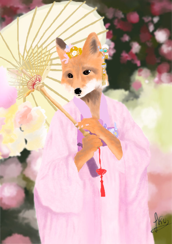 Ilustración de un zorro con características humanas, con un estilo oriental.